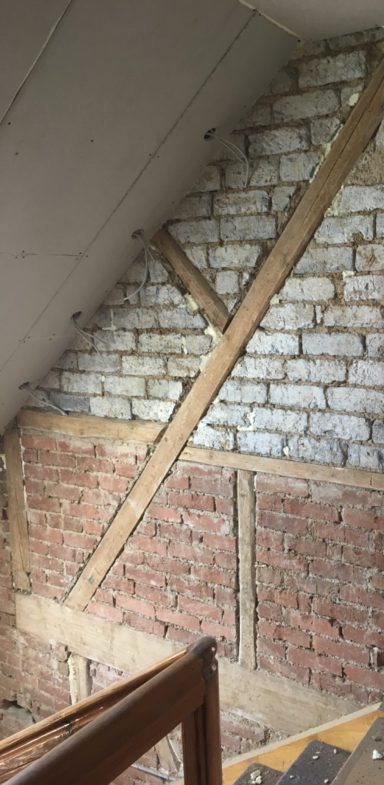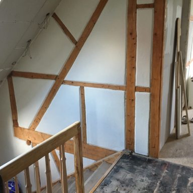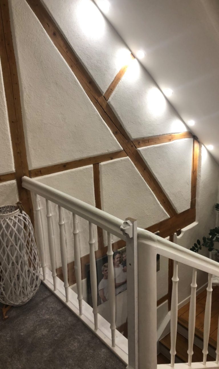 Bei der Renovierung eines Eigenheims entdeckten wir im Flur die Treppe hinauf, dass unter einer Dicken Lehm- und Strohschicht, sich schönes altes Fachwerk befand.