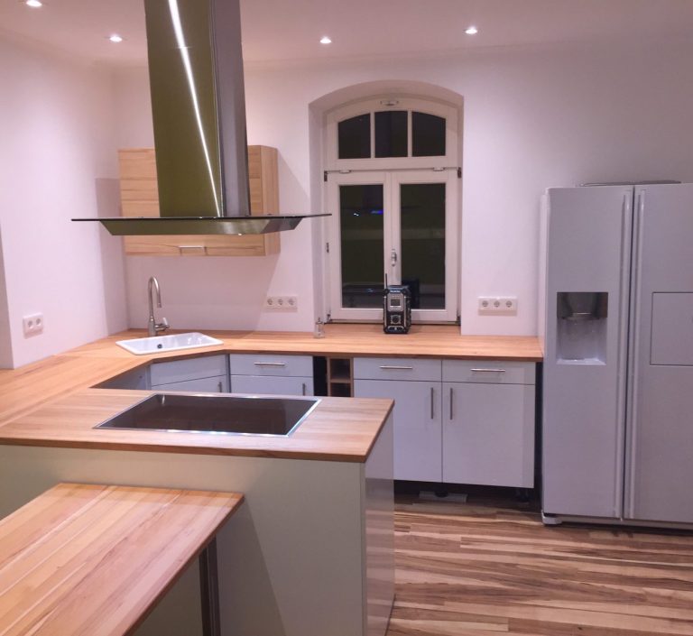 Fertig ist die renovierte Küche, mit einer abgehangenen Decke und darin verbauten Spots, einer in der Mitte hängenden Dunstabzugshaube, für das darunter liegende Induktionsfeld und einer Arbeitsplatte aus Echtholz